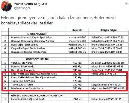 Vali Köşger'in Twitter hesabından "Evlerine giremeyen ve dışarıda kalan İzmirli hemşehrilerimizin konaklayabilecekleri tesisler:" diyerek paylaştığı listedeki yurtlar arasında TÜGVA ve Ensar Vakfı'na ait olanların da bulunduğu görüldü.