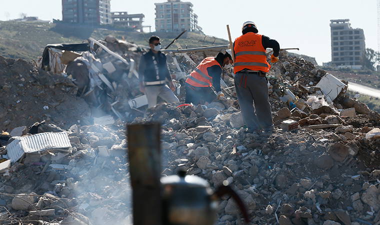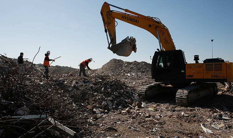 Kepçeler, yığınlardan aldıkları kalıntıları oluşturulan başka bir alana seriyor. Moloz yığınında bulunan demirler ayrıştırıldıktan sonra işçiler tırmıklarla eşyaları ayırıyor.