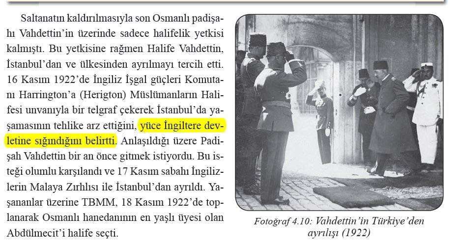 İki yıl önceki 8. sınıf Ortaokul ve İmam Hatip Ortaokulu İnkılap Tarihi ve Atatürkçülük ders kitabında, ‘Halife Vahdettin, 16 Kasım 1922'de İngiliz İşgal güçleri Komutanı Harrington'a Müslümanların Halifesi unvanıyla bir telgraf çekerek İstanbul'da yaşamasının tehlike arz ettiğini, yüce İngiltere devletine sığındığını belirtti. Anlaşıldığı üzere Padişah Vahdettin bir an önce gitmek istiyordu' şeklinde ifade yer alıyordu.
