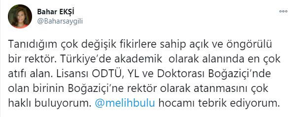 DEVA Partisi Kurucular Kurulu Üyesi Bahar Ekşi, "Tanıdığım çok değişik fikirlere sahip açık ve öngörülü bir rektör. Türkiye’de akademik olarak alanında en çok atıfı alan. Lisansı ODTÜ, YL ve Doktorası Boğaziçi’nde olan birinin Boğaziçi’ne rektör olarak atanmasını çok haklı buluyorum. Melih Bulu hocamı tebrik ediyorum" dedi.