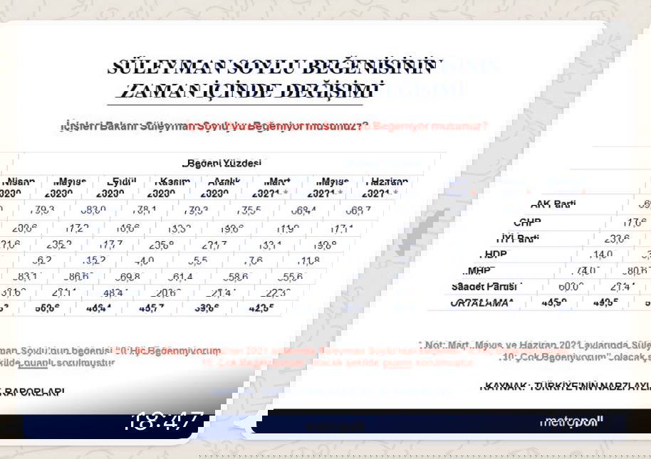 MetroPOLL Araştırma’nın Kurucusu ve Yöneticisi Özer Sencar'ın açıkladığı verilere göre MHP seçmeninde İçişleri Bakanı Süleyman Soylu’nun popülaritesi azaldı.