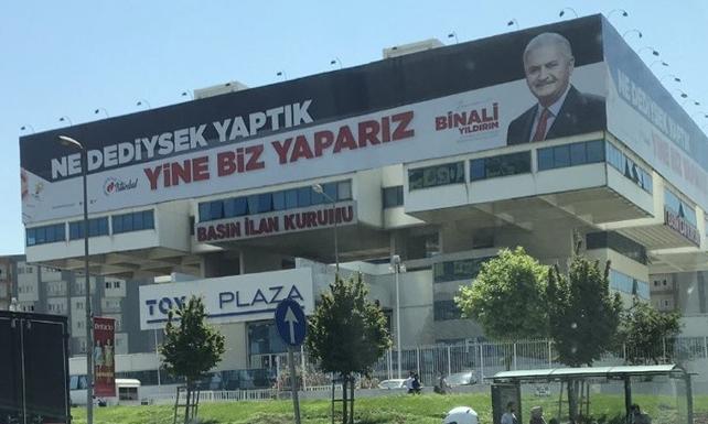 Topkapı'da Toya Plaza’nın üst katında bulunan Basın İlan Kurumu binası, AKP'nin İstanbul Binali Yıldırım’ın afişleriyle donatıldı.