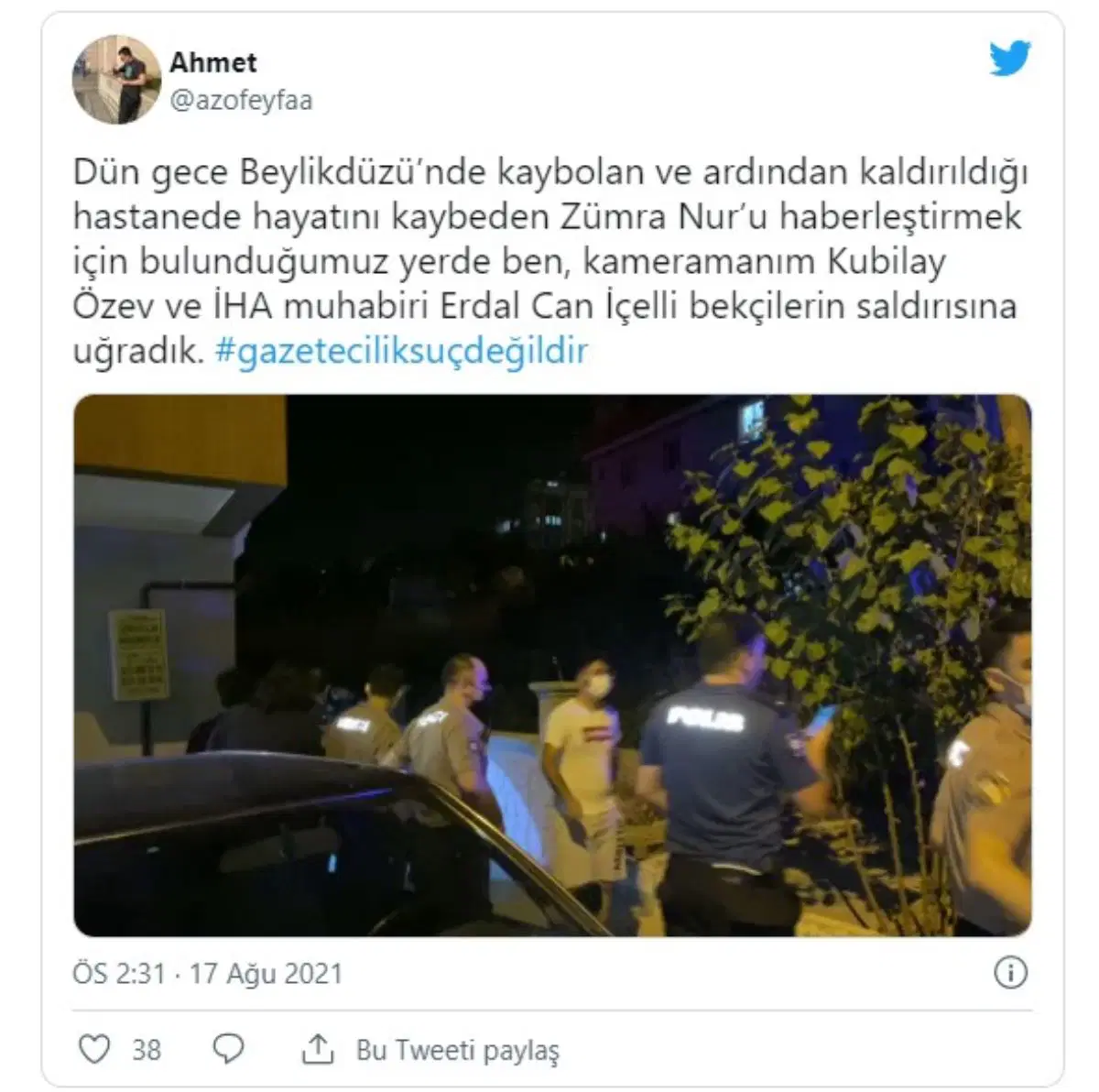 Yeşilmen bekçilerin saldırı anlarını Twitter hesabından paylaşarak "Dün gece Beylikdüzü’nde kaybolan ve ardından kaldırıldığı hastanede hayatını kaybeden Zümra Nur’u haberleştirmek için bulunduğumuz yerde ben, kameramanım Kubilay Özev ve İHA muhabiri Erdal Can İçelli bekçilerin saldırısına uğradık. #gazeteciliksuçdeğildir" ifadelerini kullandı.
