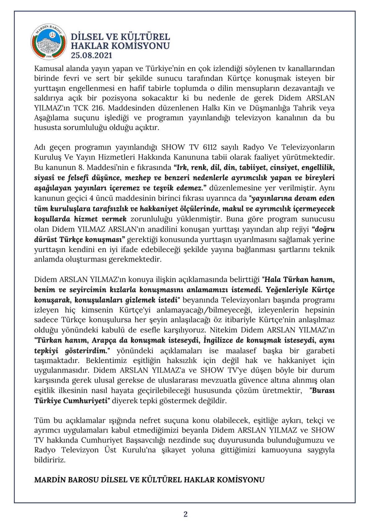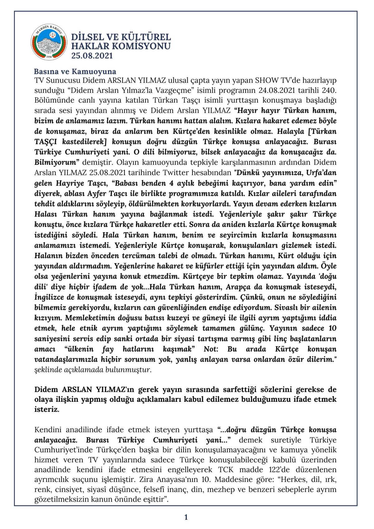Van Barosu, bir televizyon kanalında Kürtçe konuşmak isteyen konuğunu yayından alan ve “Halayla bir konuşun, doğru düzgün Türkçe konuşsun, burası Türkiye Cumhuriyeti” diyen sunucu Didem Arslan Yılmaz hakkında suç duyurusunda bulunmuştu.