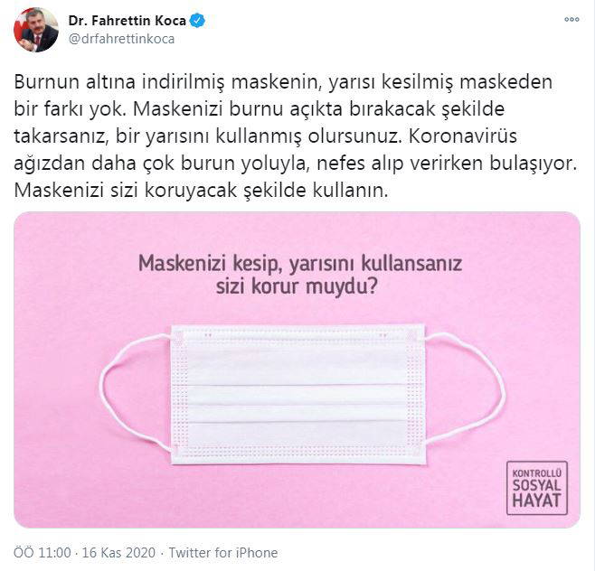 "Burnun altına indirilmiş maskenin, yarısı kesilmiş maskeden bir farkı yok. Maskenizi burnu açıkta bırakacak şekilde takarsanız, bir yarısını kullanmış olursunuz. Koronavirüs ağızdan daha çok burun yoluyla, nefes alıp verirken bulaşıyor. Maskenizi sizi koruyacak şekilde kullanın" dedi.