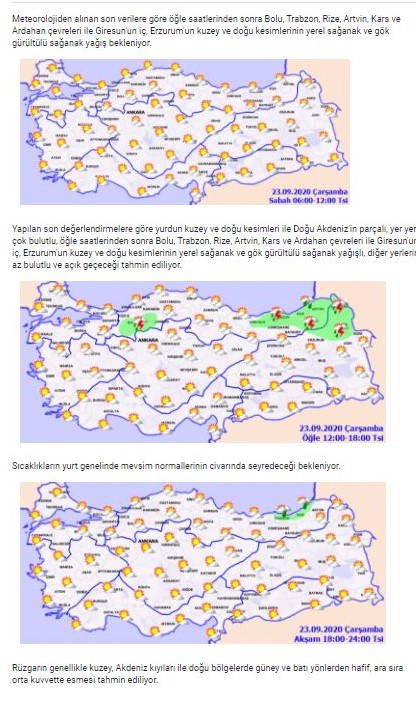 Yapılan son değerlendirmelere göre yurdun kuzey ve doğu kesimleri ile Doğu Akdeniz'in parçalı, yer yer çok bulutlu, öğle saatlerinden sonra Bolu, Trabzon, Rize, Artvin, Kars ve Ardahan çevreleri ile Giresun'un iç, Erzurum'un kuzey ve doğu kesimlerinin yerel sağanak ve gök gürültülü sağanak yağışlı, diğer yerlerin az bulutlu ve açık geçeceği tahmin ediliyor.