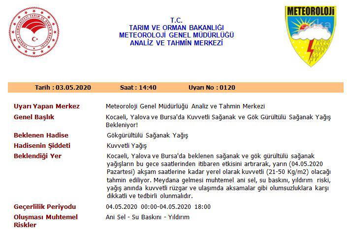 “Kocaeli, Yalova ve Bursa'da beklenen sağanak ve gök gürültülü sağanak yağışların bu gece saatlerinden itibaren etkisini artırarak, yarın (04.05.2020 Pazartesi) akşam saatlerine kadar yerel olarak kuvvetli (21-50 Kg/m2) olacağı tahmin ediliyor. Meydana gelmesi muhtemel ani sel, su baskını, yıldırım riski, yağış anında kuvvetli rüzgar ve ulaşımda aksamalar gibi olumsuzluklara karşı dikkatli ve tedbirli olunmalıdır.”