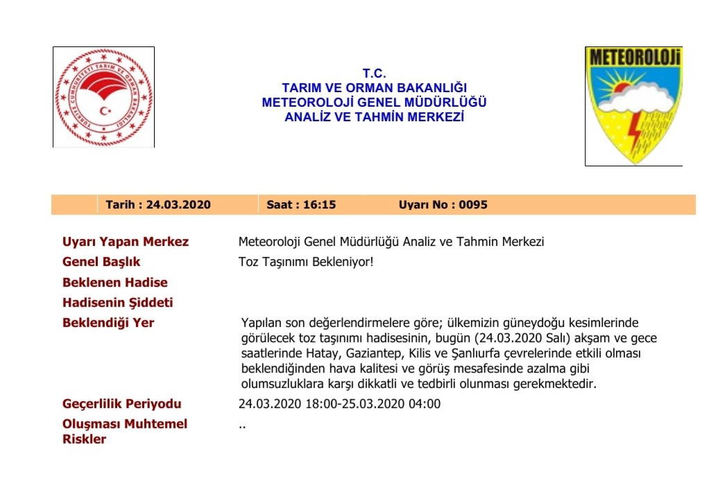 "Yapılan son değerlendirmelere göre; ülkemizin güneydoğu kesimlerinde görülecek toz taşınımı hadisesinin, bugün (24.03.2020 Salı) akşam ve gece saatlerinde Hatay, Gaziantep, Kilis ve Şanlıurfa çevrelerinde etkili olması beklendiğinden hava kalitesi ve görüş mesafesinde azalma gibi olumsuzluklara karşı dikkatli ve tedbirli olunması gerekmektedir."