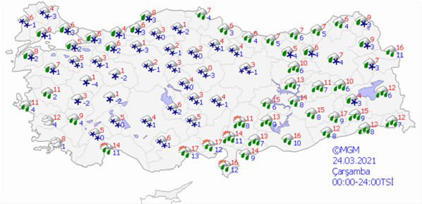 Meteoroloji Genel Müdürlüğü, haftalık hava durumuna (24 -30 Mart 2021) ilişkin bilgilerini paylaştı. Paylaşımda hava sıcaklıklarının ülke genelinde hissedilir derecede 6 ila 15 derece azalacağız, mevsim normallerinin altında seyredeceğinin tahmin edildiği bildirildi. İstanbul'da çarşamba akşam saatlerinden itibaren karla karışık yağmur bekleniyor. AKOM'dan, "Çarşamba akşam saatlerinden itibaren Balkanlar üzerinden Sibirya kökenli yeni bir soğuk hava dalgasının Marmara Bölgesi’ne giriş yapması bekleniyor." açılaması yapıldı. Ulaşımda aksamalar, ani sel, su baskını, yıldırım, yerel dolu yağışı, yağış anında kuvvetli rüzgar gibi olumsuzluklara karşı dikkatli ve tedbirli olunması istendi.