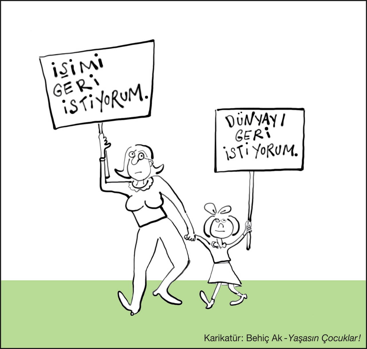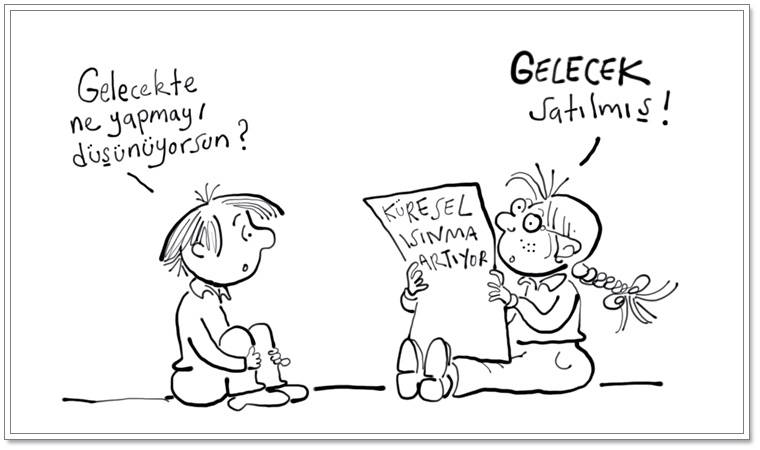 Bir başka karikatürünüzde çocuk arkadaşına şöyle diyor: “Biz dijital iletişim çağı çocuklarıyız.” Arkadaşının yanıtı ise çarpıcı: “Bence eşitsizlik, aşırı üretim, küresel ısınma, kimlikçilik, adaletsizlik ve naylon torba çağı çocuklarıyız”.