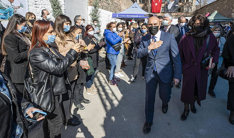İzmir Büyükşehir Belediyesi’nin 8 Mart Dünya Emekçi Kadınlar günü etkinlikleri kapsamında Basmane’deki tarihi Bıçakçı Han’da düzenlediği Kadın Emeği Sergi ve Satış Pazarı açıldı. Büyükşehir’in 2020 yılının Ekim ayında satın alarak yeniden kent yaşamına kazandırdığı Bıçakçı Han, üreten emekçi kadınların kurduğu stantlarla ve tarihi Basmane bölgesinin kültürel özelliklerini yansıtan ürün ve atölye çalışmalarıyla ilk misafirlerini ağırladı. İzmir Büyükşehir Belediye Başkanı Tunç Soyer, eşi ve İzmir Köy-Koop Birlik Başkanı Neptün Soyer ile birlikte Kadın Emeği Sergi ve Satış Pazarı’nı gezerek üretici kadınların 8 Mart Dünya Kadınlar Günü’nü kutladı, bereket testisini kırarak sergi ve pazarının bereket getirmesini diledi.