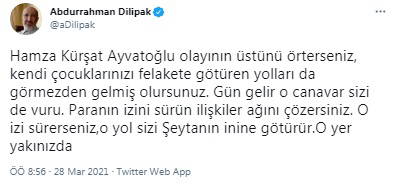 Abdurrahman Dilipak, sosyal medya hesabından iktidara "Hamza Kürşat Ayvatoğlu olayının üstünü örterseniz, kendi çocuklarınızı felakete götüren yolları da görmezden gelmiş olursunuz. Gün gelir o canavar sizi de vurur. Paranın izini sürün ilişkiler ağını çözersiniz. O izi sürerseniz, o yol sizi şeytanın inine götürür. O yer yakınızda." diye uyarı yaptı.