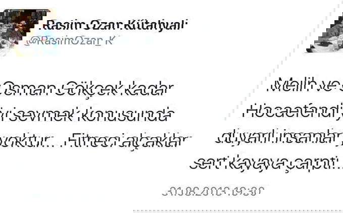 Rıdvan Dilmen’in bu eleştirilerinin ardından Rasim Ozan Kütahyalı’nın 2013’te FETÖ, Melih Gökçek ve Osman Gökçek hakkında attığı övgü dolu tweet gündeme geldi. Kütahyalı yaptığı paylaşımında, “Melih ve Osman Gökçek kadar Hocaefendi’yi sevmek konusunda duyarlı insanlar yoktur… Fitneci alçaklar sert kayaya çarptı” kullandığı ortaya çıktı.