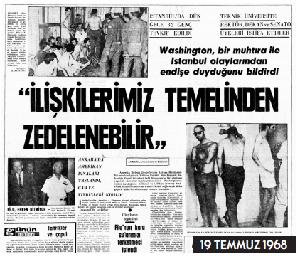 Yine 6. Filo’nun geliş provokasyonları zincirinin halkaları içinde ülkemizde yaşanan olayların sayfalarını paylaşmak gereksiz ve olanaksız. Amerika’nın ağır tehdit içeren çıkışı ile İTÜ’nün öğrencilerini koruyamayan, kendileri de polis saldırısına hedef olan yönetimlerinin istifasını getiren tek bir sayfayı 19 Temmz tarihli Cumhuriyet’i paylaşmakla yetiniyorum.. Amerikalı askerlerin, Dolmabahçe’den denize döküldükleri o ünlü olaylarından sonraki gelişmeler.. Harun Karadeniz’in yönetim ve sorumluluğunda Birliğin Gümüşsuyu öğrenci yurduna yönelik polis operasyonları, Vedat Demircioğlu’nun ölümü. Yine Beyazıt -Taksim arasında on binlerin katıldığı protesto yürüyüşleri..