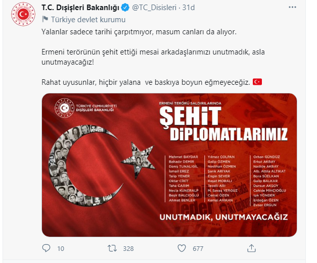 Resmi sosyal medya hesabından "Yalanlar sadece tarihi çarpıtmıyor, masum canları da alıyor." diyen Dışişleri Bakanlığı, "Ermeni terörünün şehit ettiği mesai arkadaşlarımızı unutmadık, asla unutmayacağız! Rahat uyusunlar, hiçbir yalana ve baskıya boyun eğmeyeceğiz." ifadelerini kullandı.