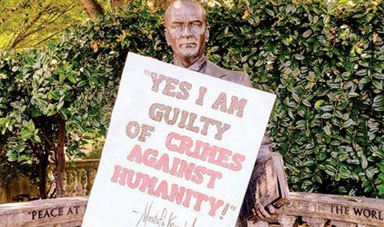 Washington'da perşembe günü Türk büyükelçilik konutu önündeki Atatürk heykeline yönelik saldırıda, heykelin üzerine İngilizce "Evet, insanlığa karşı işlenen suçlardan suçluyum" yazılı pankart asılmıştı.