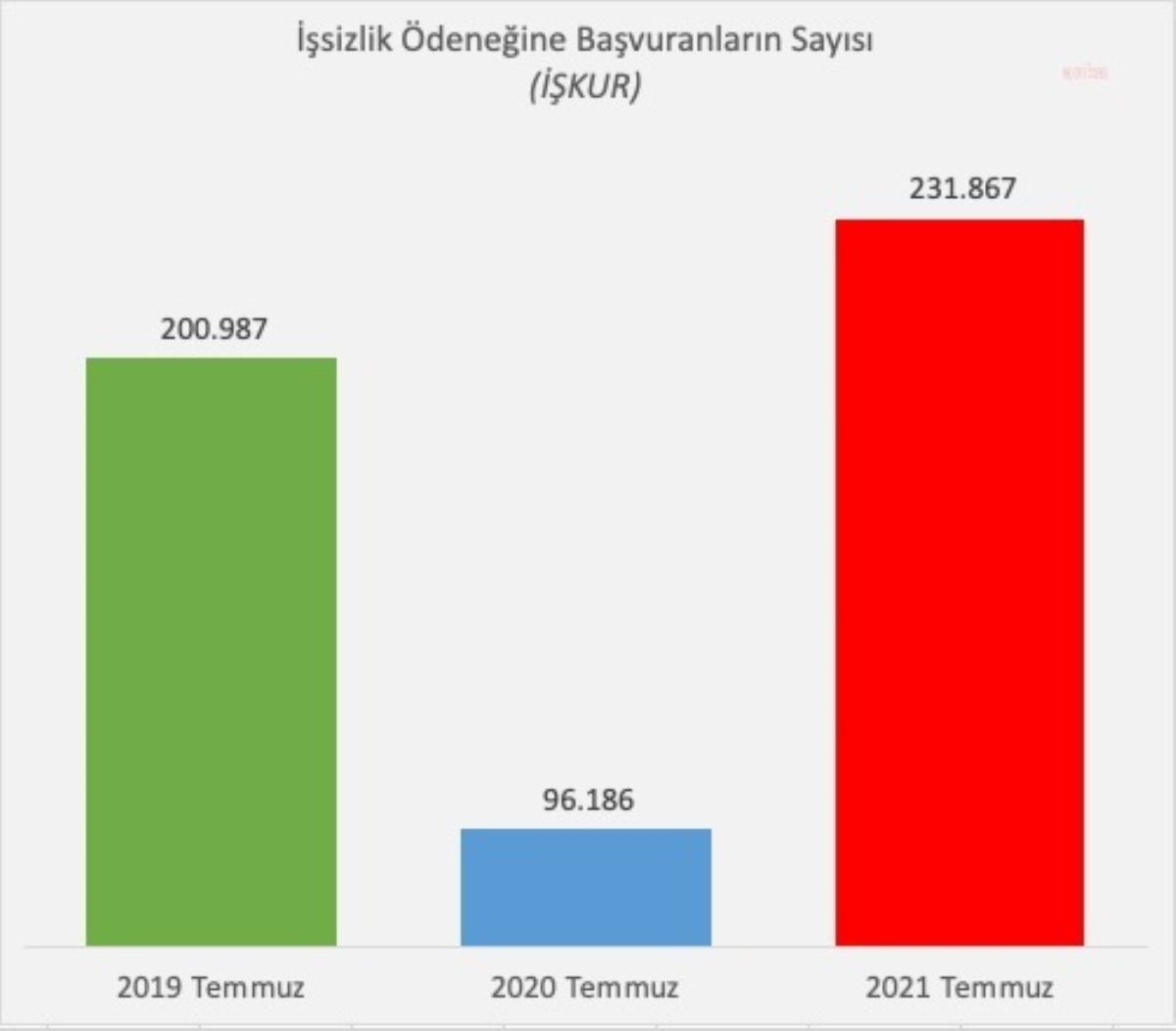 "2021 temmuz ayı işsizlik ödeneği başvuruları önceki yılları aştı. 2019 temmuz ayında 201 bin olan işsizlik ödeneği başvurusu fesih yasağı döneminde (2020 temmuz) 96 bine gerilemişti. Fesih yasağının kalkması sonrasında (temmuz 2021'de) ise 232 bine yükseldi.