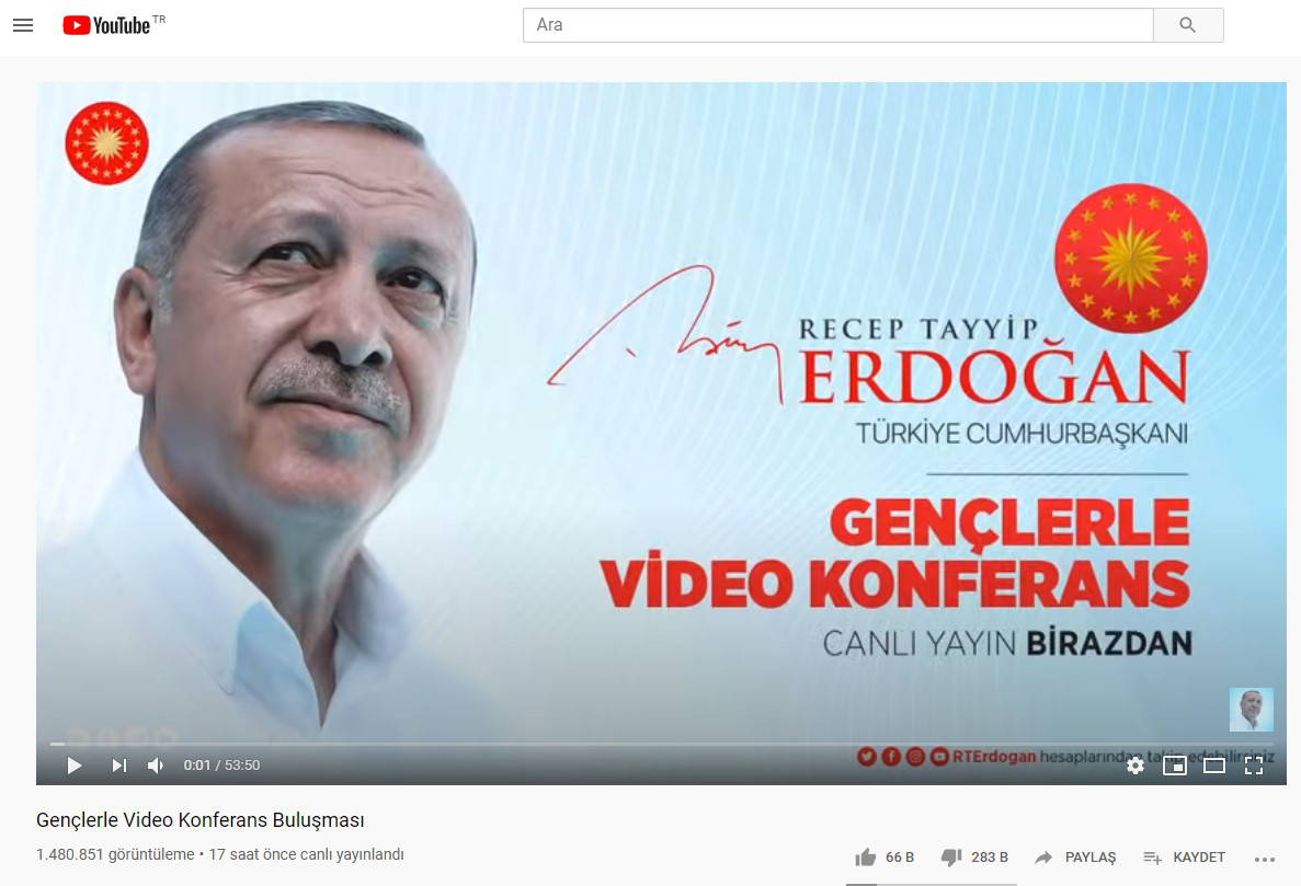 Erdoğan'ın gençlerle yaptığı yayının YouTube'daki videosuna kısa sürede 280 binden fazla 'dislike' atıldı. (Youtube'da beğenmeme butonuna basılması) Sayı her geçen dakika daha da artıyor.