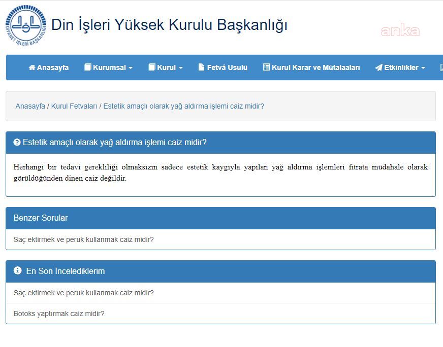 Diyanet İşleri Başkanlığı internet sitesindeki "Sık sorulan sorular" bölümünde Din İşleri Yüksek Kurulu Başkanlığı’na “Estetik amaçlı olarak yağ aldırma işlemi caiz midir?” diye soruldu. Başkanlığın verdiği yanıta göre sağlık amaçlı yağ aldırmak caiz ancak estetik amaçlı yağ aldırma bu kapsama girmiyor. Başkanlık yağ aldırmayla ilgili “Herhangi bir tedavi gerekliliği olmaksızın sadece estetik kaygıyla yapılan yağ aldırma işlemleri fıtrata müdahale olarak görüldüğünden dinen caiz değildir” dedi.
