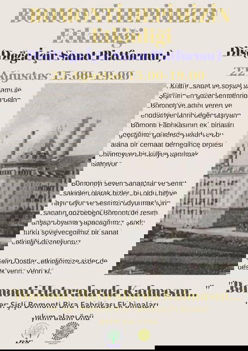 "Bomonti hatıralarda kalmasın" demek için düzenlenen etkinlik, yarın (22 Ağustos) 15.00-19.00 saatleri arasında yapılacak.