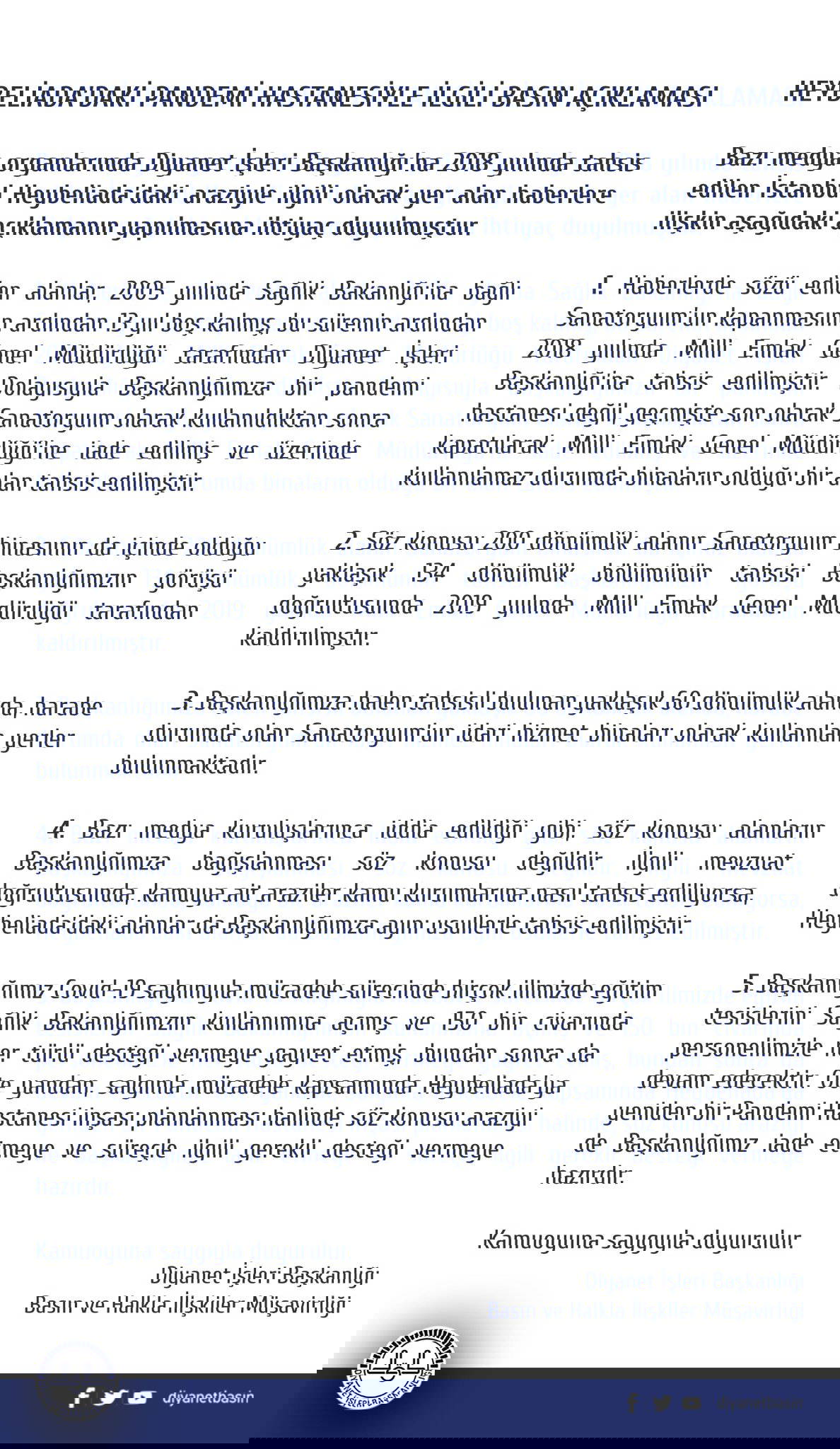 1. Haberlerde sözü edilen alanlar, 2005 yılında Sağlık Bakanlığı'na bağlı Sanatoryum’un kapanmasının ardından 13 yıl boş kalmış, bu sürenin ardından 2018 yılında Milli Emlak Genel Müdürlüğü tarafından Diyanet İşleri Başkanlığı’na tahsis edilmiştir. Dolayısıyla Başkanlığımıza bir pandemi hastanesi değil, geçmişte son olarak Sanatoryum olarak kullanıldıktan sonra kapatılarak Milli Emlak Genel Müdürlüğü’ne iade edilmiş ve üzerinde kullanılamaz durumda binaların olduğu bir alan tahsis edilmiştir.