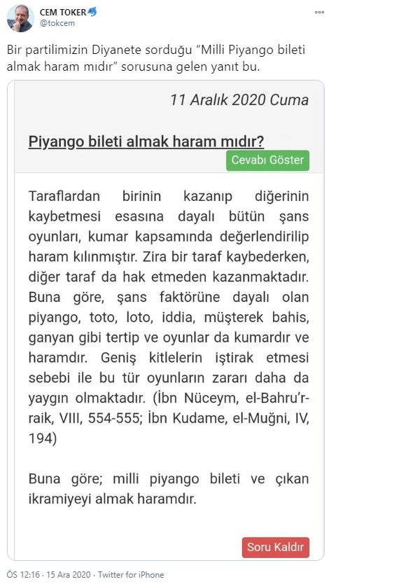 Diyanet, konuyla ilgili resmi bir açıklama yapmazken LDP üyesi bir kişi, kuruma “Milli Piyango bileti almak haram mıdır?” sorusunu gönderdi. Cem Toker, 11 Aralık Cuma günü Diyanet'ten gelen yanıtı paylaştı.
