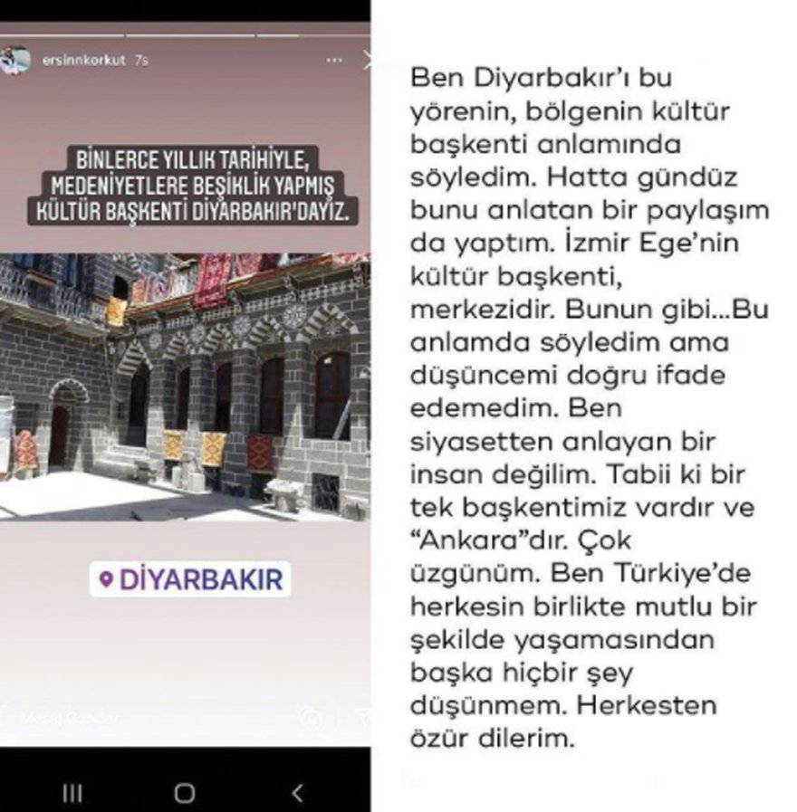 "Ben Diyarbakır'ı bu yörenin, bölgenin kültür başkenti anlamında söyledim. Hatta gündüz bunu anlatan bir paylaşım yaptım. İzmir Ege'nin kültür başkenti, merkezidir. Bunun gibi... Bu anlamda söyledim ama düşüncemi doğru ifade edemedim. Ben siyasetten anlayan bir insan değilim. Tabii ki bir başkentimiz vardır ve Ankara'dır. Çok üzgünüm. Ben Türkiye'de herkesin birlikte mutlu bir şekilde yaşamasından başka hiçbir şey düşünmem. Herkesten özür dilerim" ifadelerini kullandı.