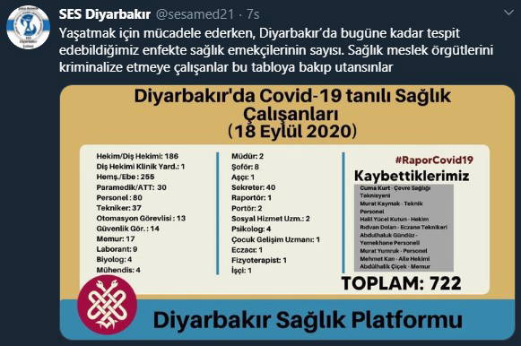 Sağlık ve Sosyal Hizmet Emekçileri Sendikası Diyarbakır Şubesi'de tabloyu sosyal medyadan paylaşarak, "Yaşatmak için mücadele ederken, Diyarbakır’da bugüne kadar tespit edebildiğimiz enfekte sağlık emekçilerinin sayısı. Sağlık meslek örgütlerini kriminalize etmeye çalışanlar bu tabloya bakıp utansınlar" dedi.