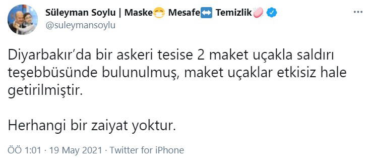 İçişleri Bakanı Süleyman Soylu, Twitter hesabından yaptığı açıklamada patlamanın, Diyarbakır’da bir askeri tesiste gerçekleştiğini belirtti. Olayda herhangi bir can kaybının yaşanmadığı aktarıldı.