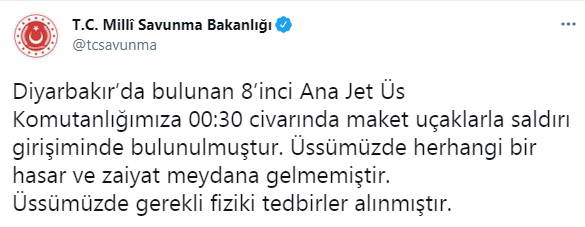 MSB'nin Twitter hesabından yapılan açıklamada, "Diyarbakır'da bulunan 8'inci Ana Jet Üs Komutanlığımıza 00.30 civarında maket uçaklarla saldırı girişiminde bulunulmuştur. Üssümüzde herhangi bir hasar ve zaiyat meydana gelmemiştir. Üssümüzde gerekli fiziki tedbirler alınmıştır" ifadeleri kaydedildi.