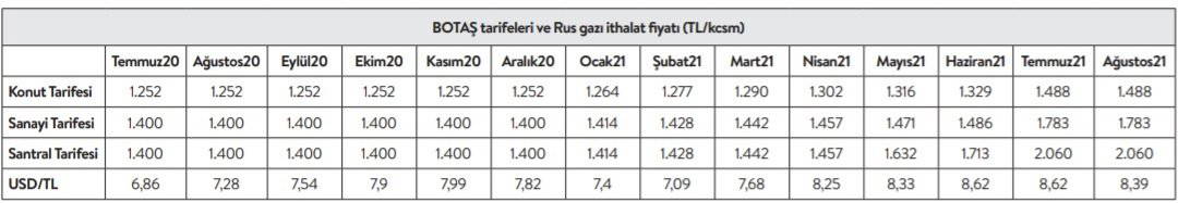 Şu an 238 dolar olan Botaş'ın Rus gazı alım fiyatının 2021'in son çeyreğinde yaklaşık 270 dolara yükselebileceğini, 2022’nin ilk çeyreğinde daha da artmasının beklendiğini belirten Aktürk, Türkiye’nin kış döneminde artan talebin bir kısmını şu an çok daha yüksek fiyatta olan spot LNG ile karşılamak zorunda olduğunu ve ithalat maliyetinin daha da artacağını, 2022 yaz aylarına kadar yüksek fiyatların görülmeye devam edeceğini dile getirdi.