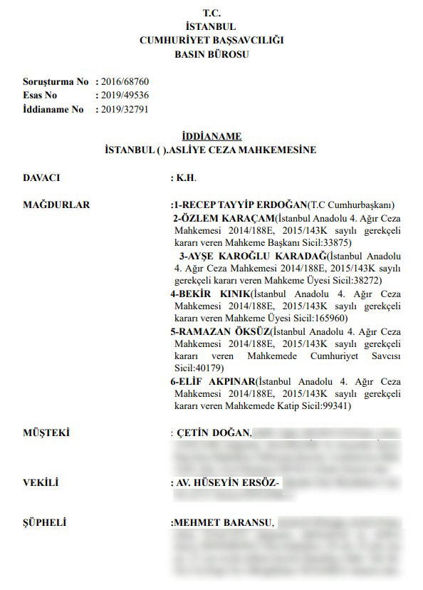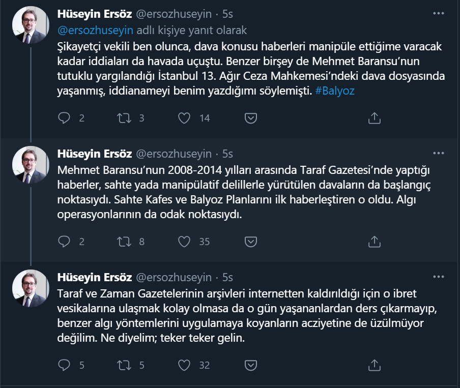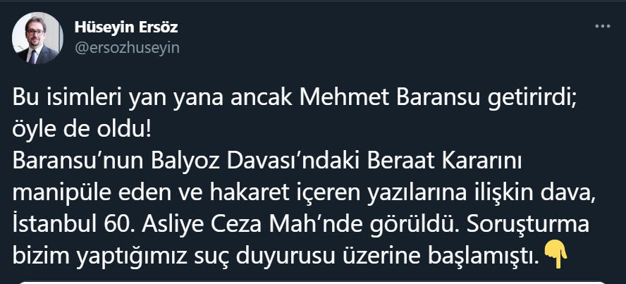 FETÖ’nün kapatılan yayın organı Taraf gazetesinin muhabiri Mehmet Baransu’nun, Balyoz kumpası davasındaki beraat kararını manipüle eden ve hakaret içeren yazılarına ilişkin davanın, İstanbul 60. Asliye Ceza Mahkemesi’nde görüldüğünü belirten Ersöz, Doğan’ın Mehmet Baransu hakkında suç duyurusu ile başlayan soruşturmanın iddianamesindeki mağdurlar arasında Cumhurbaşkanı Recep Tayyip Erdoğan da bulunduğunu belirtti.