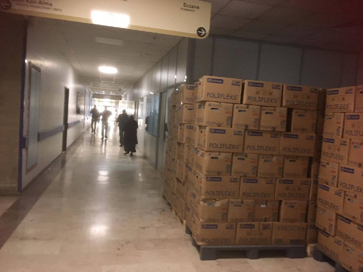 Eksi birinci kattaki koridor ilaç kolileri yığılı. Damar yolu hastalıklarında kullanılan polifleks kutuları, depo yerine koridora istiflenmiş vaziyette.