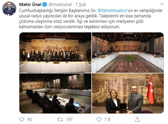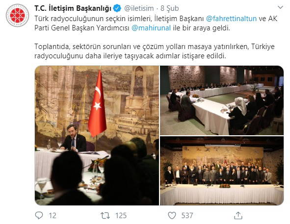 Toplantıdan sonra İletişim Başkanlığı’nın resmi Twitter hesabında yayınlanan açıklamada, “Türk radyoculuğunun seçkin isimleri, İletişim Başkanı Fahrettin Altun ve AK Parti Genel Başkan Yardımcısı Mahir Ünal ile bir araya geldi” denildi.