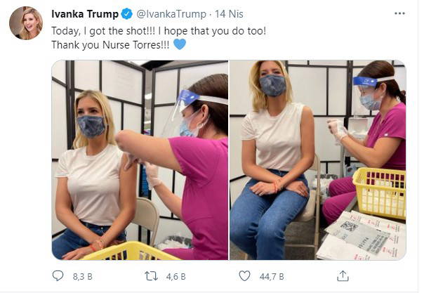 ABD'nin eski başkanı Donald Trump'ın kızı Ivanka Trump, iki gün önce sosyal medya hesabından koronavirüs aşısı olduğu anların fotoğrafını paylaşarak "Bugün aşı oldum. Umarım siz de olmuşsunuzdur" ifadelerini kullandı. Paylaşımın ardından Ivanka Trump, babası Donald Trump’ın destekçileri tarafından linç edildi.