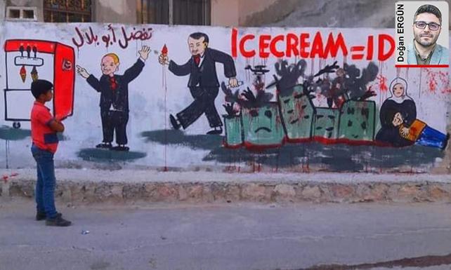 İdlib’de duvara çizilen karikatürde Erdoğan’a tepki vardı.