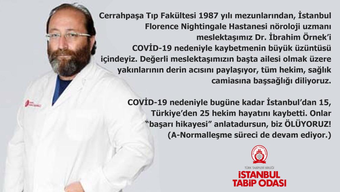 İstanbul Tabip Odası’ndan yapılan açıklamada “Cerrahpaşa Tıp Fakültesi 1987 yılı mezunlarından, İstanbul Florence Nightingale Hastanesi nöroloji uzmanı meslektaşımız Dr. İbrahim Örnek’i Covid-19 nedeniyle kaybetmenin büyük üzüntüsü içindeyiz. Değerli meslektaşımızın başta ailesi olmak üzere yakınlarının derin acısını paylaşıyor, tüm hekim, sağlık camiasına başsağlığı diliyoruz” denildi. Koronavirüs nedeniyle Türkiye’de 25 hekimin yaşamını yitirdiği anımsatılan açıklamada “Covid-19 nedeniyle bugüne kadar İstanbul’dan 15, Türkiye’den 25 hekim hayatını kaybetti. Onlar ‘başarı hikayesi’ anlatadursun, biz ölüyoruz! (A-Normalleşme süreci de devam ediyor)” ifadelerine yer verildi.