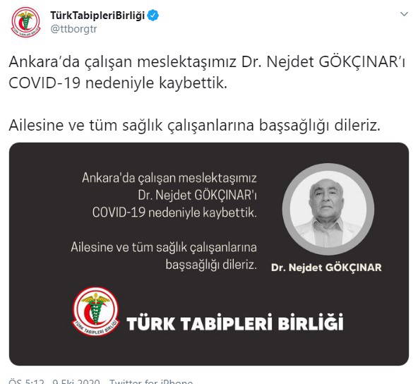 ''Ankara’da çalışan meslektaşımız Dr. Nejdet Gökçınar’ı Covıd-19 nedeniyle kaybettik. Ailesine ve tüm sağlık çalışanlarına başsağlığı dileriz.''
