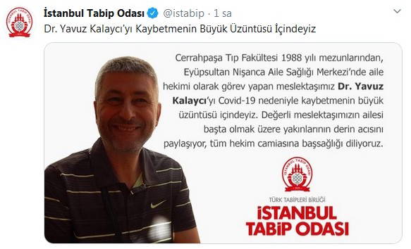 Kalaycı'nın yaşamını yitirmesinin ardından Twitter'dan başsağlığı dileyen İstanbul Tabip Odası (İSTABİP), "Cerrahapaşa Tıp Fakültesi mezunlarından Eyüpsultan Nişanca Aile Sağlığı Merkezi’nde aile hekimi olarak görev yapan meslektaşımız Dr. Yavuz Kalaycı'yı, Kovid-19 nedeniyle kaybetmenin büyük üzüntüsü içindeyiz. Değerli meslektaşımızın ailesi başta olmak üzere yakınlarının derin acısını paylaşıyor, tüm hekim camiasına başsağlığı diliyoruz" paylaşımında bulundu.
