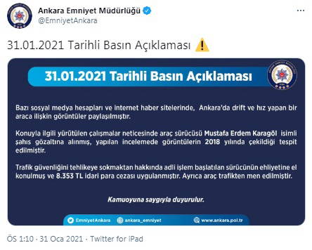 Olayla ilgili Ankara Emniyet Müdürlüğünün Twitter hesabından yapılan açıklamada, "Konuyla ilgili yürütülen çalışmalar neticesinde araç sürücüsü Mustafa Erdem Karagöl isimi şahıs gözaltına alınmış, yapılan incelemede görüntülerin 2018 yılına ait olduğu tespit edilmiştir. Trafik güvenliğini tehlikeye sokmaktan hakkında adli işlem başlatılan sürücünün ehliyetine el konulmuş ve 8 bin 353 TL idari para cezası uygulanmıştır. Ayrıca araç trafikten men edilmiştir" denildi.