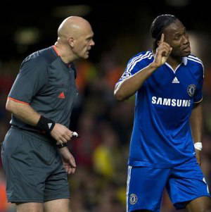 Geçtiğimiz sezon Şampiyonlar Ligi'nde yarı finalde karşılaştıkları ve Barcelona'nın son dakikalarda attığı gol ile elendikleri maç sonrası Norveçli orta hakem Tom Henning Ovrebo'nun yanına gidip kötü sözler söylediği televizyon kayıtlarından tespit edilen Drogba 6 maç ceza aldı.