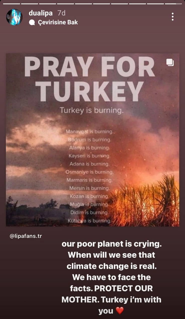 "Zavallı gezegenimiz yanıyor. İklim değişikliğinin gerçek olduğunu ne zaman göreceğiz. Gerçeklerle yüzleşmeliyiz. ANNEMİZİ KORU (doğa ana). Türkiye, seninleyim."