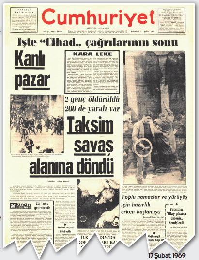 12 Şubat günlü sayfamızda Taksim’deki büyük polis-öğrenci çatışmasına geniş yer verilmiş. 50 yaralı, 68 gözaltı bilgisi de var. O dönem istihbarat şefimiz, etik duruşu ile gazetecilik için simge, Sevgili polis muhabirimiz Selahattin Güler’i, özel nedenlerle de bir kez daha saygıyla anmam gerek. Sayfada yaralı olarak hastaneye kaldırılışının fotoğrafı da var.
