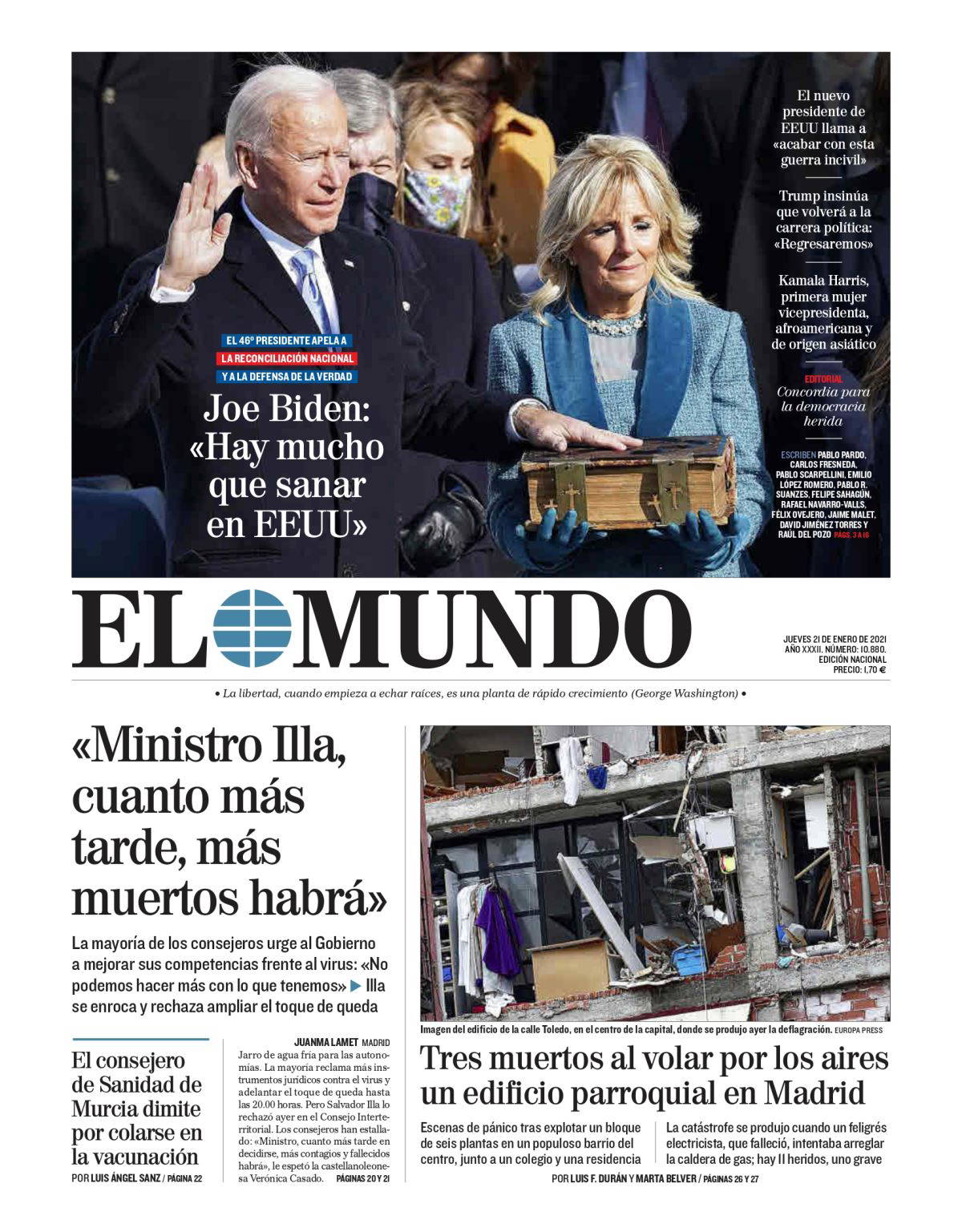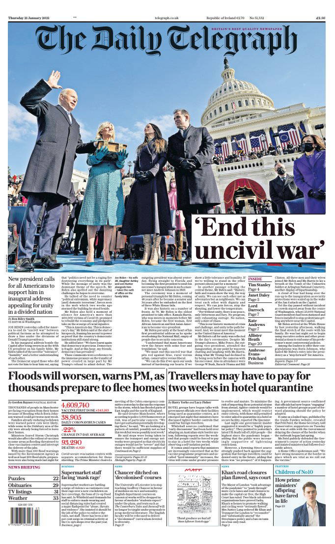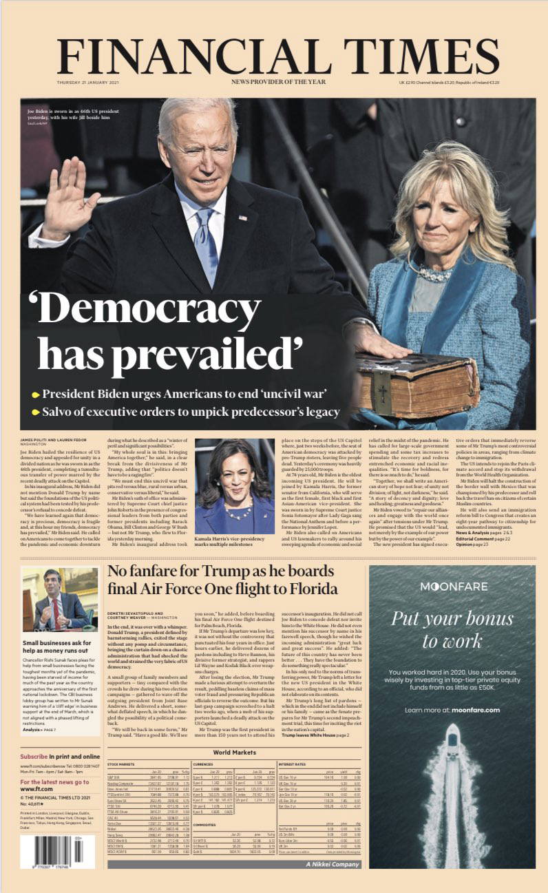 ABD’nin 46’ncı Başkanı Joe Biden, yemin ederek görevine başladı. Kongre baskınıyla tepkileri üzerine toplayan Trump’ın ardından Biden, için atılan manşetlerde birleştirici bir lider olduğu vurgulandı, “demokrasi galip geldi” ve "birlik olma zamanı" başlıkları kullanıldı.