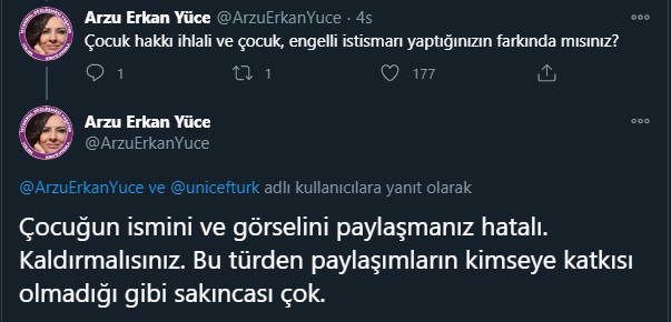 Erkan Yüce, UNICEF Türkiye tweetindeki çocuğun isminin ve görselinin paylaşılmasının hatalı olduğunu belirterek "Kaldırılmalı. Çocuk hakkı ihlali ve istismarıdır. Yalnız eleştirmek için ilgili tw/görseli alıntılayarak paylaşmak da aynı kapıya çıkıyor. Görseli yaygınlaştırmış oluyoruz" dedi.