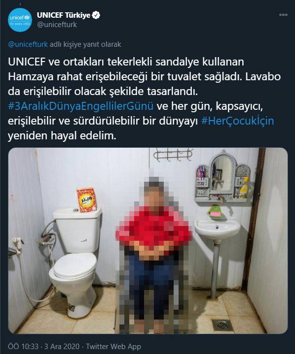 "UNICEF ve ortakları tekerlekli sandalye kullanan H.'ya rahat erişebileceği bir tuvalet sağladı. Lavabo da erişilebilir olacak şekilde tasarlandı. 3 Aralık Dünya Engelliler Günü ve her gün, kapsayıcı, erişilebilir ve sürdürülebilir bir dünyayı Her Çocuk İçin yeniden hayal edelim."