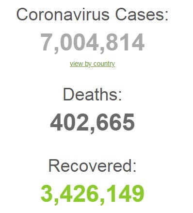 Worldometers verilen göre, dünya genelinde koronavirüs tespit edilen kişi sayısı toplamda 7 milyon 4 bin 814’e ulaştı. Dünya genelinde 402 bin 665 kişi de virüs nedeniyle hayatını kaybederken; toplamda 3 milyon 426 bin 149 kişinin ise hastalığı yenerek iyileştiği belirtildi.