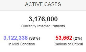 Verilere göre dünya genelinde 3 milyon 176 bin aktif vaka bulunuyor ve bunlardan 53 bin 662’sinin durumunun ciddi olduğu açıklandı.