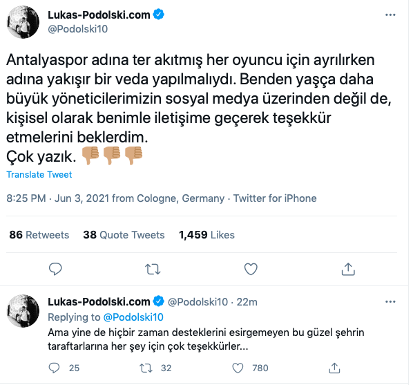 Lukas Podolski, paylaşımında kırmızı-beyazlı ekipten ayrıldıktan sonra Antalyasporlu yöneticilerin kendini arayıp teşekkür etmediğinin altını çizerek “Benden yaşça daha büyük yöneticilerimizin sosyal medya üzerinden değil de, kişisel olarak benimle iletişime geçerek teşekkür etmelerini beklerdim. Çok yazık.” ifadelerini kullandı.