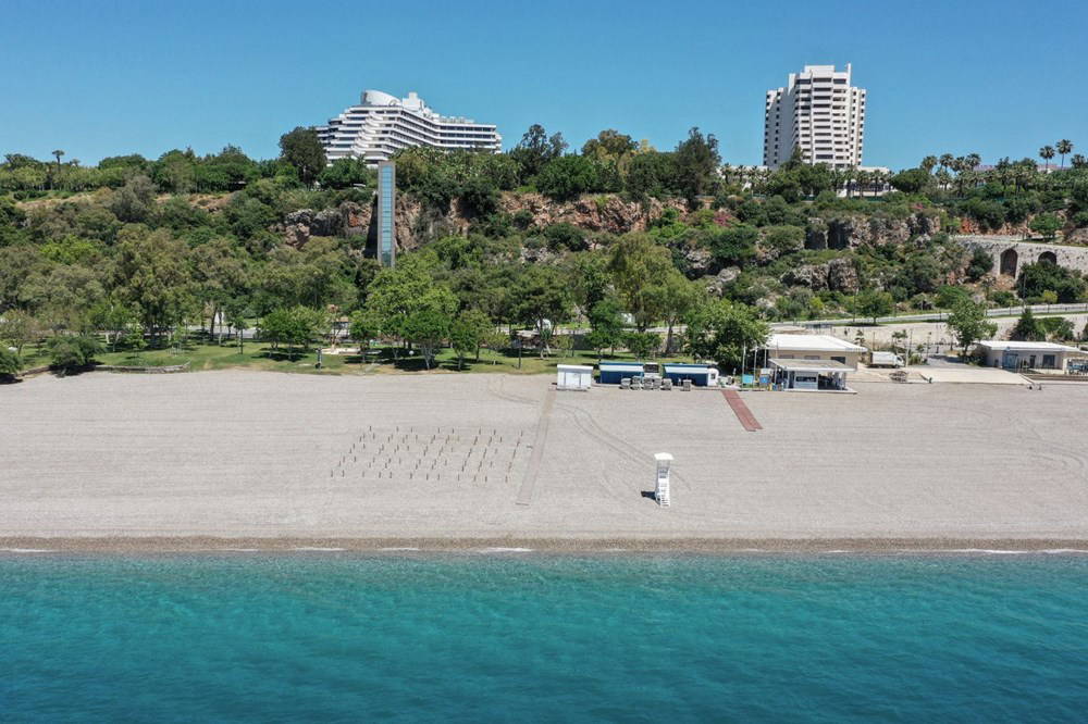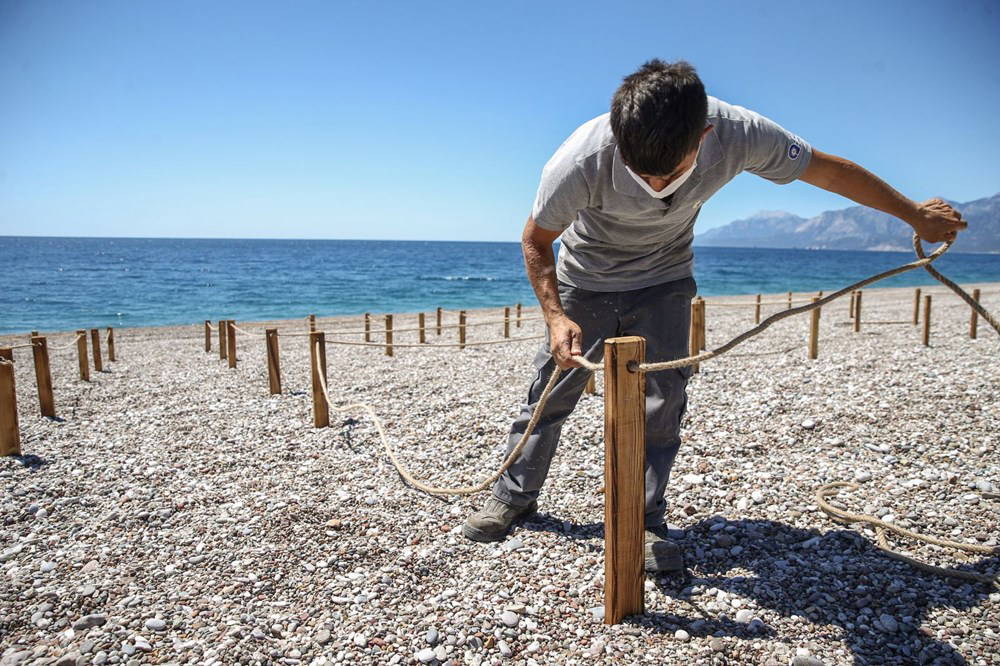 Antalya'nın dünyaca ünlü Konyaaltı Sahili, denize girip plajda güneşlenecek yerli ve yabancı turistler için Covid-19 tedbirlerine uygun olarak düzenleniyor.